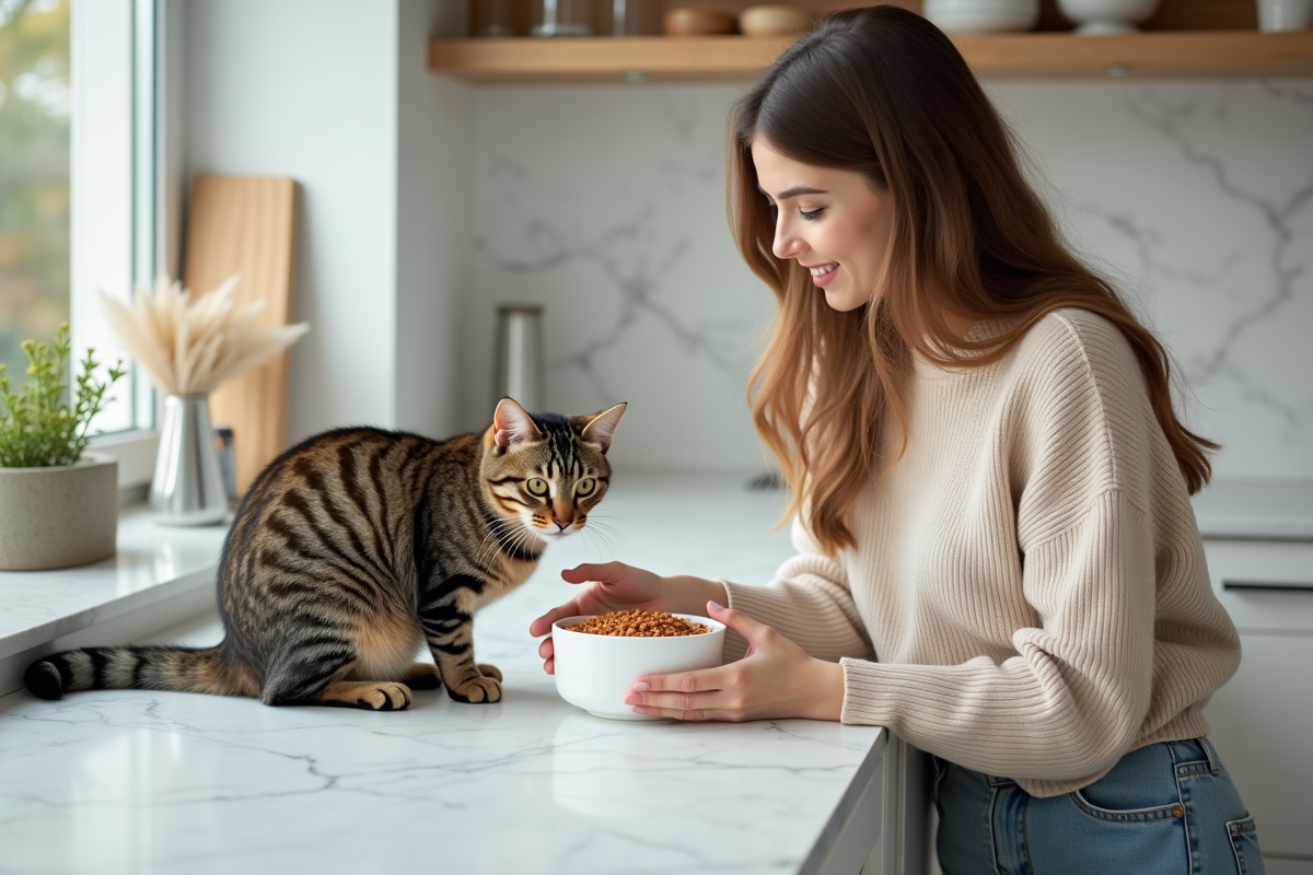 Jeune femme offrant de la nourriture à un chat dans la cuisine