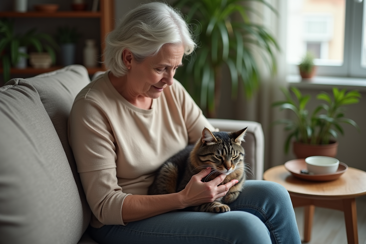 Femme âgée caressant un chat sur ses genoux dans un salon chaleureux