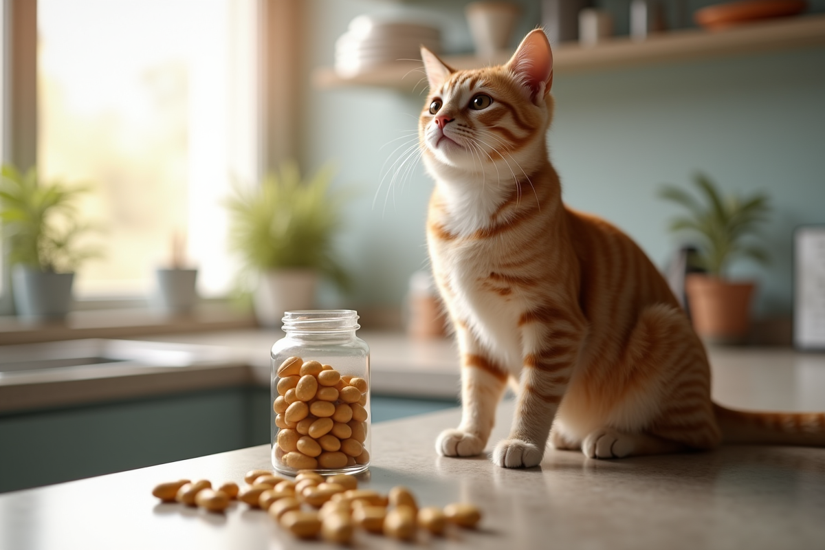 Chat domestique curieux sur le comptoir avec compléments alimentaires